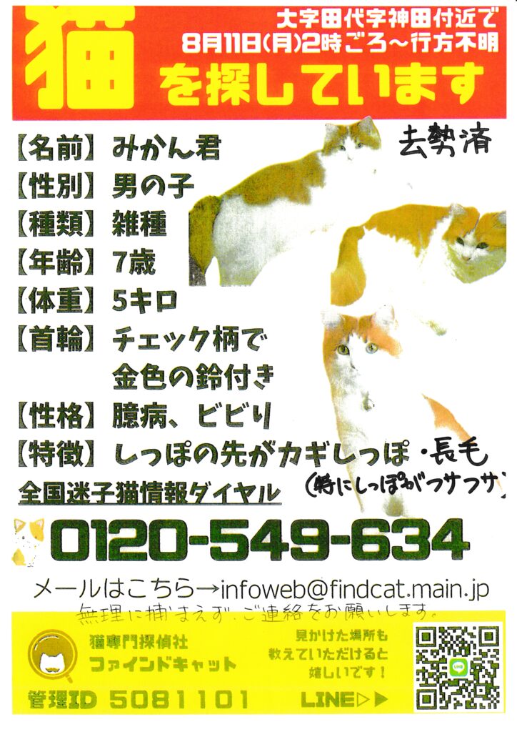 見かけた方は下記の連絡先までご連絡お願い致します。