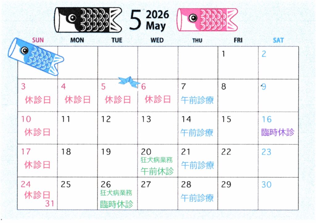 5/20(水)は狂犬病業務のため午前休診、5/26(火)は臨時休診となります。